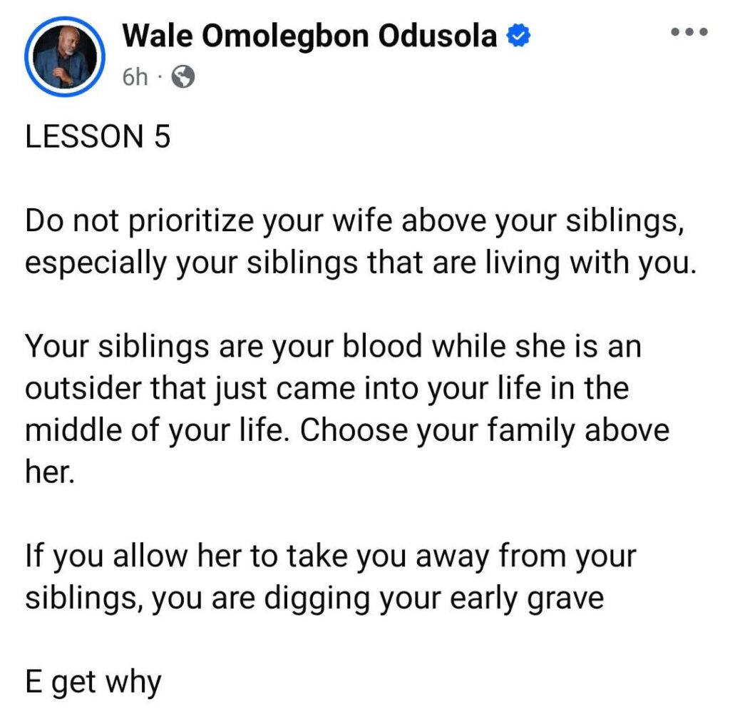 A Nigerian legal practitioner, Wale Omolegbon Odusola, has advised men to choose their siblings over their wives.